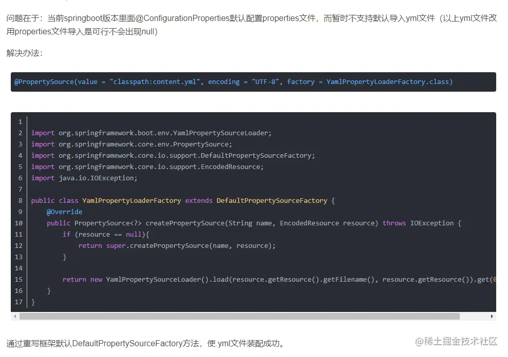 通过springboot2中@ConfigurationProperties装载yml文件的时候调取出现值为null的解决办法和springboot 加载自定义yml文件(@PropertySource)了解到,@PropertySource默认不支持yml文件,需要新建类,继承DefaultPropertySourceFactory,重写createPropertySource方法。