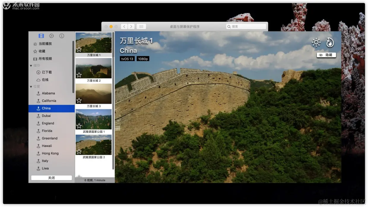 aerial mac汉化版是一个专为mac用户制作的屏幕保护程序,正如名字所说,该屏保视频取材自苹果零售店Apple TV的专用屏保,全部由苹果自制作的航拍影片,里面的每一个航拍都是不可多得的精美作品!不仅为您带来视觉上的享受,还能不增加电脑内的硬件负担。