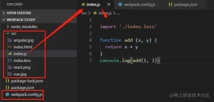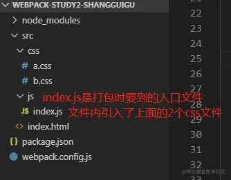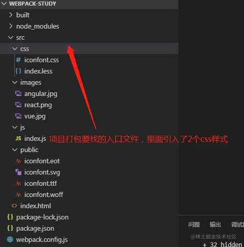 1、指令解析:webpack会以 ./src/index.js 为入口文件开始打包,打包后输出到 ./build/built.js;整体打包环境,是开发环境