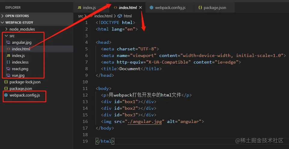2、指令解析:webpack会以 ./src/index.js 为入口文件开始打包,打包后输出到 ./build/built.js;整体打包环境,是生产环境