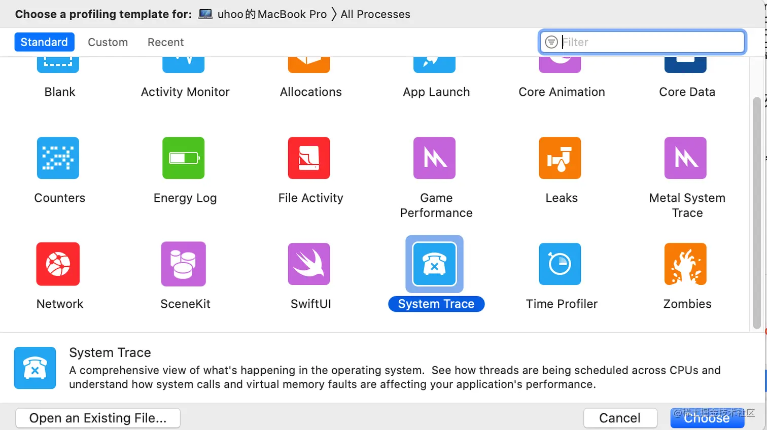 Xcode打开Instruments,找到System Trace - 调试结果如下