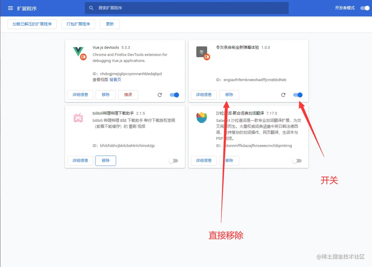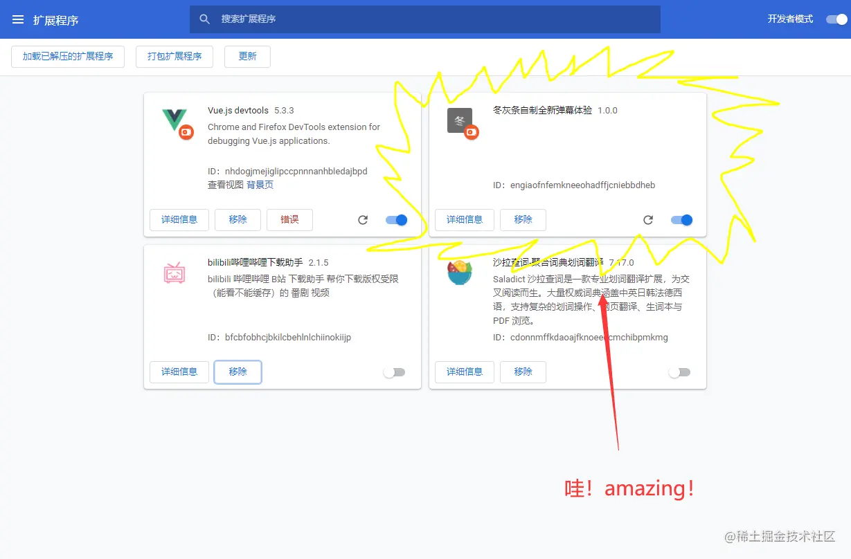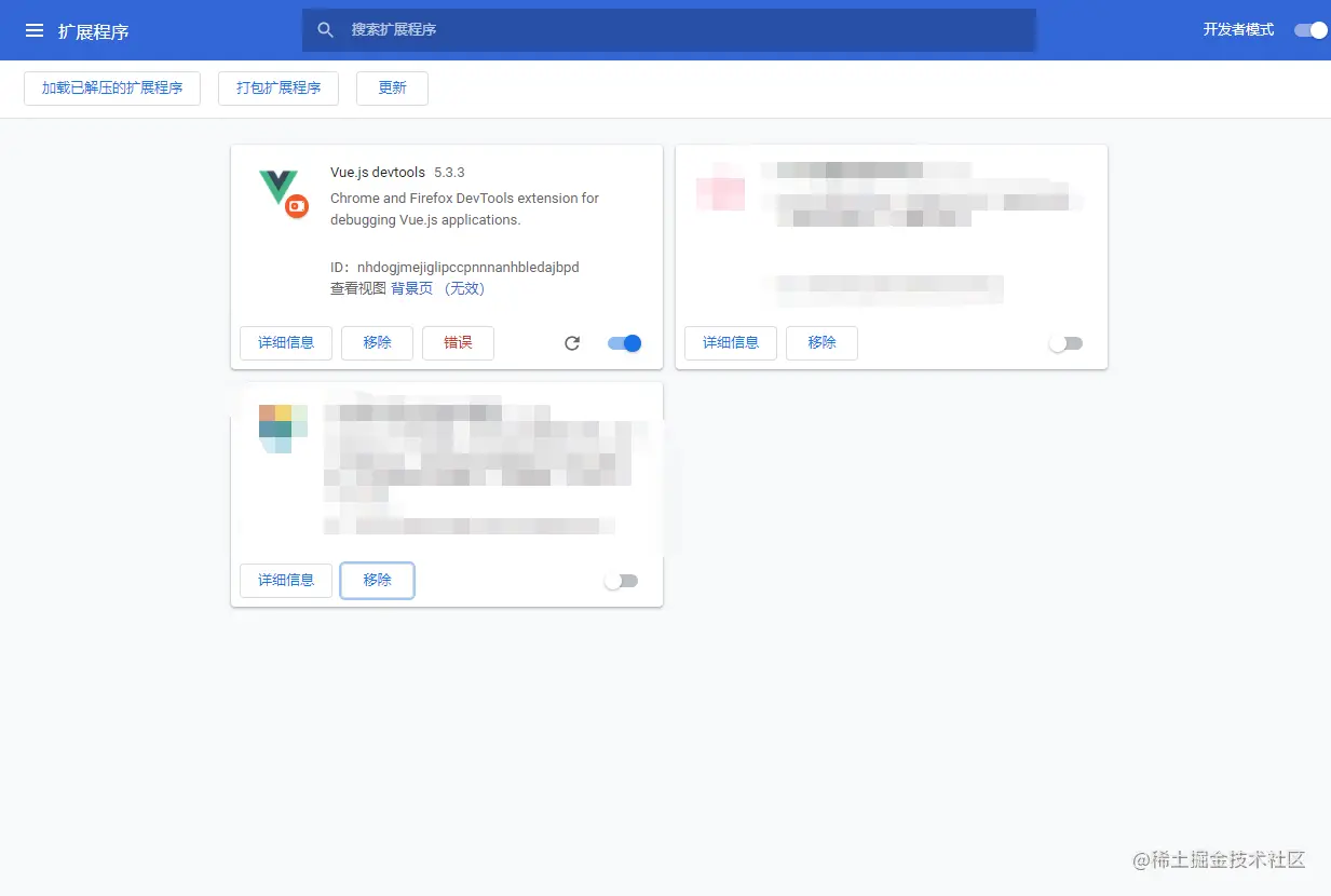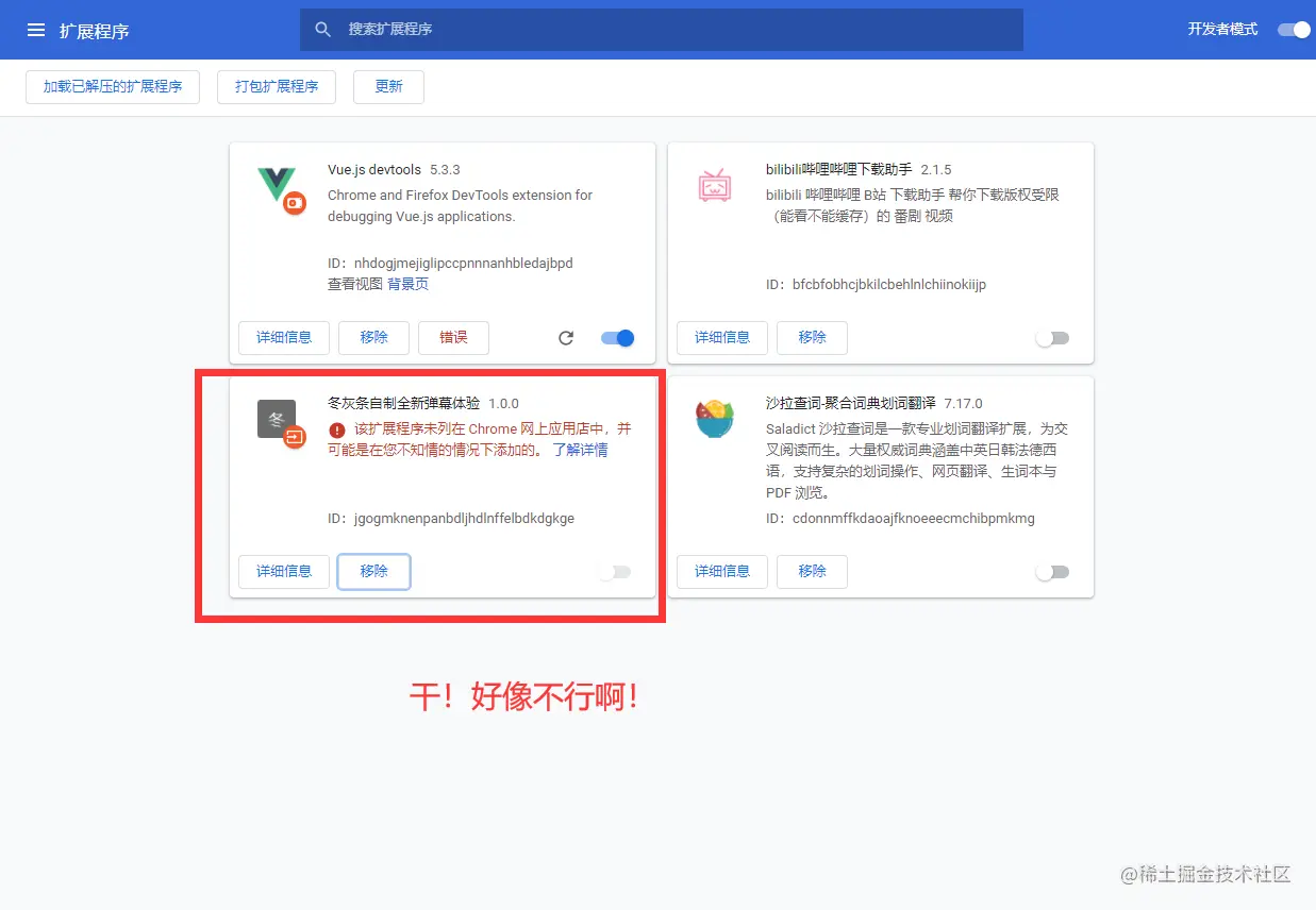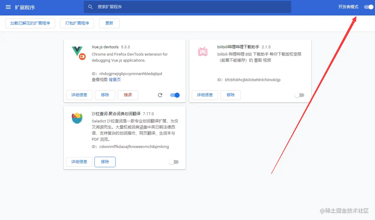 那只能让大家换个方式了。直接开启开发模式,也就是右上角那个,开启开发模式: