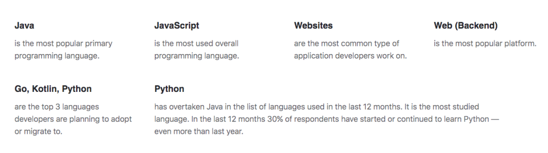 开发者首选的编程语言还是集中在JavaSript,Java和Python等。