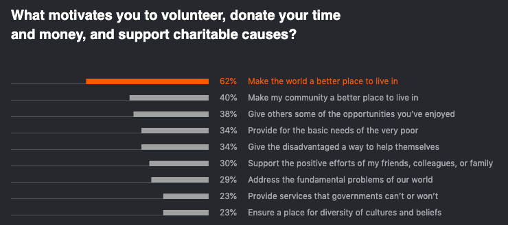 开发者绝对是一群对这个世界爱的深沉的家伙们!有52%的受访者表示参加过慈善活动,62%的程序员想用代码构建一个更好的世界。