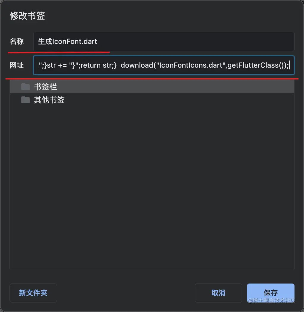 将名称改为“生成IconFont.dart”,复制上面的代码并粘贴在网址里