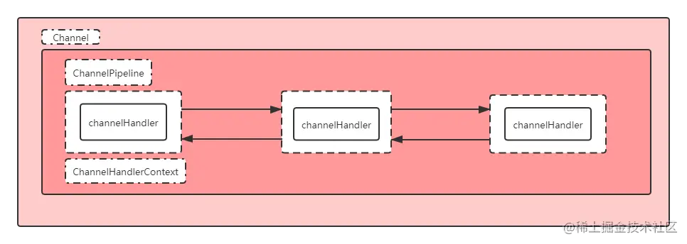 Channel包含了一个ChannelPipeline,而ChannelPipeline中又维护了一个由ChannelHandlerContext组成的双向链表,并且每个ChannelHandlerContext中又关联着一个ChannelHandler -