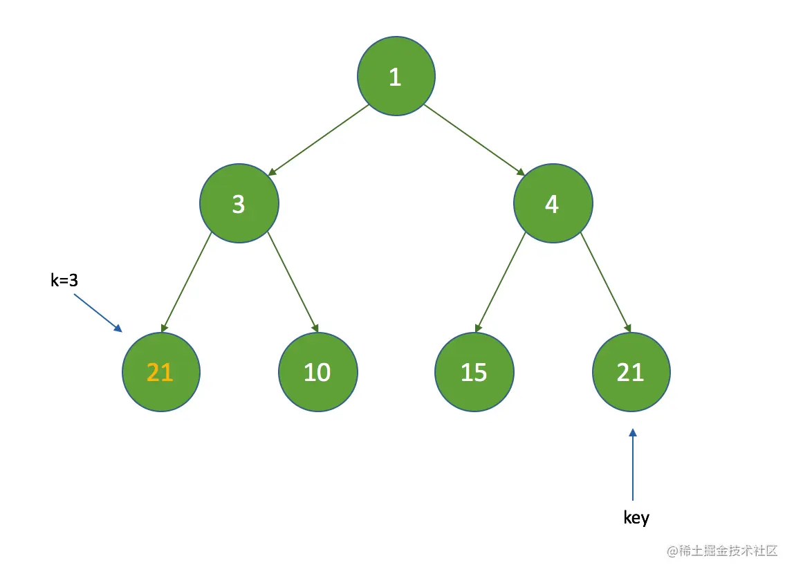 - 假设 k = 3 ,那么 k = half ,没有子节点,在执行siftDown方法时直接把索引为3的节点设置为数组的最后一个节点: