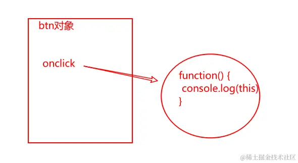 <body> <button id="btn">按钮</button> <script> let btn = document.getElementById("btn"); btn.onclick = function() { console.log(this); } //<button id="btn">按钮</button> </script> </body>函数被赋值给btn的onclick属性,btn调用onclick,this指向btn