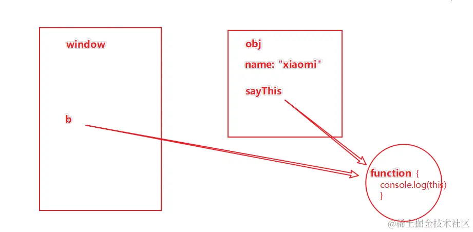 let obj = { name: "小米", sayThis() { console.log(this); } } var b = obj.sayThis; console.log(window.b);//sayThis() {console.log(this);} b();//window设obj.sayThis指向的函数为该函数,在执行var b = obj.sayThis, b便指向该函数。如果声明使用var, b便绑定在window对象上。b在调用的时候是独立调用(没有使用xx对象.b()调用),所以指向window