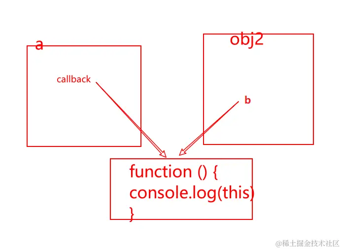 let obj1 = { b() { console.log(this);//window } } function a(callback) { callback(); } a(obj1.b)设obj.b为该函数,a函数调用的时候,将该函数赋值给a函数内执行作用域内callback变量, callback没有绑定任何的对象,所以是独立调用,默认指向window
