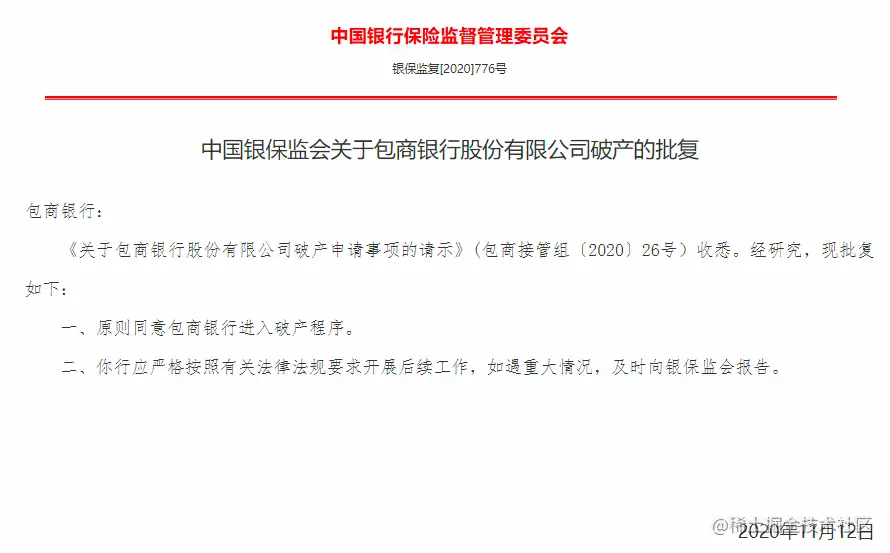 11 月 23 日,中国银保监会发布关于包商银行股份有限公司破产的批复称,原则同意包商银行进入破产程序。