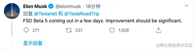 马斯克发推称特斯拉第 5 个测试版全自动驾驶将在未来数天内推出