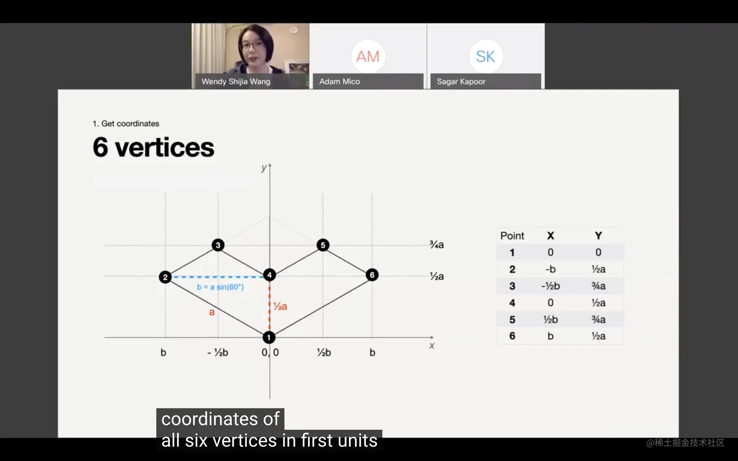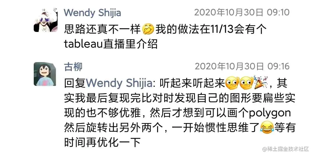 其实最后复现完古柳也注意到自己的图形较之原作更扁,才想到可以先画一个多边形再旋转出另外两个(而非各种瞎调凑出一个类正方体/cube),这也正是 Wendy 原本的方式。只不过当时整个作品已经优化了很久,就懒得再改了。这次一拖延,正好赶上分享,得以确认实现方式和古柳所想一致,也可以修改下复现的代码,用更优雅的方式实现,也方便讲解。