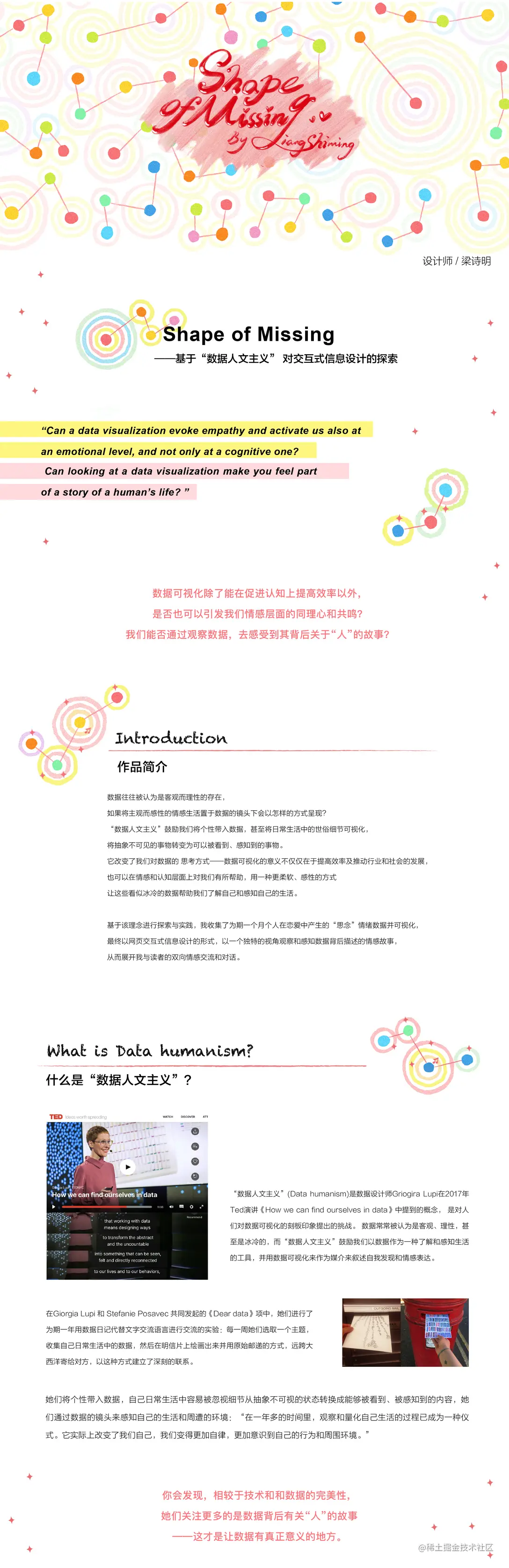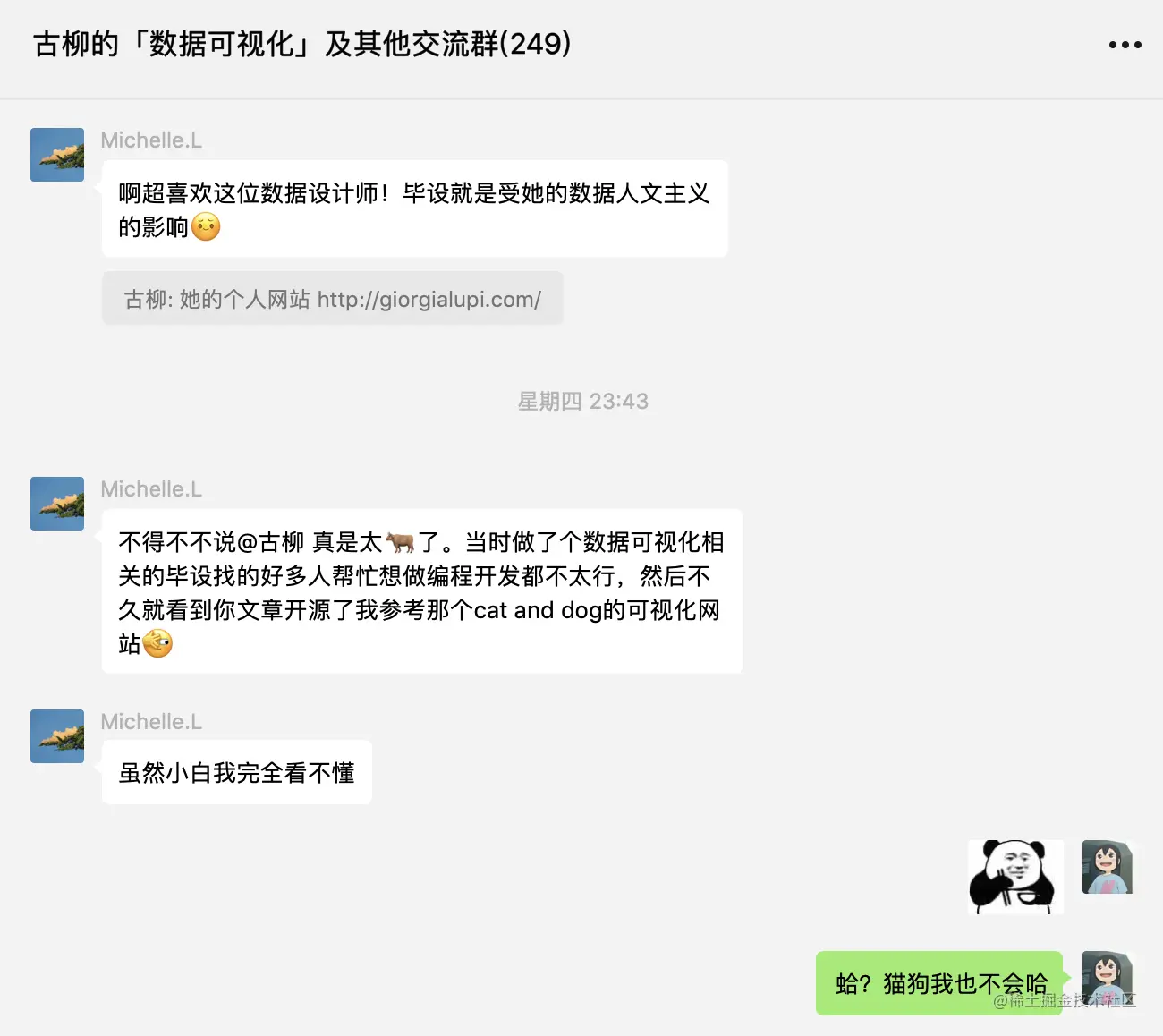 顺势问起她毕设的作品——「Shape of Missing——基于“数据人文主义”对交互式信息可视化设计的探索」——于是猝不及防,群友们一起吃起甜甜的狗粮。欢迎大家去b站三连支持,也欢迎群里交流。
