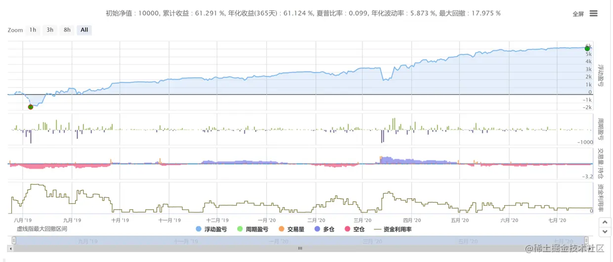 如初始账户有余额10000元,币1个,币价8000,总资金=10000+1*8000=18000元。运行一段时间的策略后,当前账户余额2000u, 币2个,币价9000,总资金=2000+2*9000=20000元。绝对收益=20000-18000=2000元。但初始账户里就已经持有了一个币,就算不运行策略,最终也有1000元收益,所以策略带来的收益只有1000元。这种计算方式就是浮动收益,浮动收益=当前余额+当前币*当前价格 -(初始余额+初始币*当前价格)。