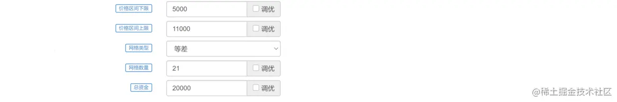网格策略所需要的参数相对复杂一些,需要设置网格上下限,网格类型,格子数量,投入资金等参数。策略启动时币价在8000元,这里设置网格的上下限为加减3000元,格子总量为21个,资金全部投入。这里参数如下图: