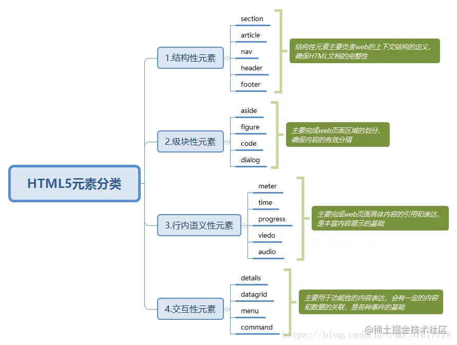 HTML5 中,元素主要分为4类:结构性元素,块级性元素,行内语义性元素,交互性元素