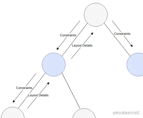 layout方法是在三棵树生成之后执行,计算各个部分的大小。其具体可分为两个线性过程:从顶部向下传递约束,从底部向上传递布局信息,其过程可用下图表示。