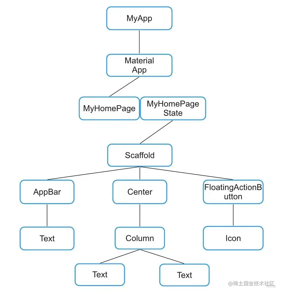 - Flutter组件渲染流程可以对照参考HTML的DOM树概念。例如创建工程默认生成的代码,他的代码层级结构可以绘制成这样一颗树(Widget 树),当然在 Flutter 体系结构中,这段代码离真正GPU渲染还有好些步骤。
