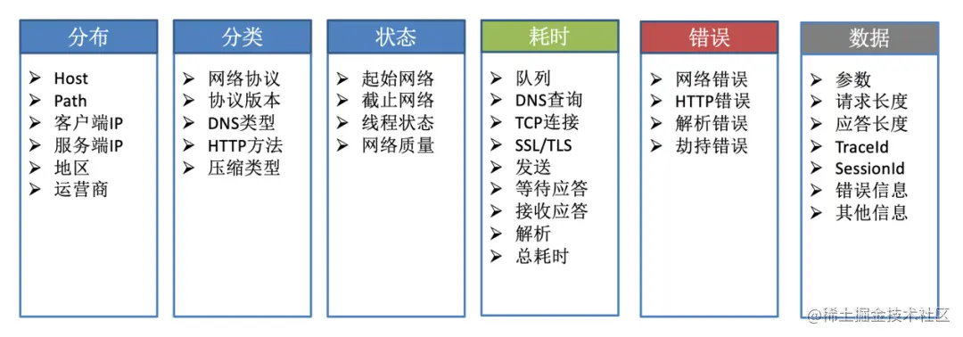 APM 系统为了能够实现帮助企业确保自身的 IT 支撑系统高效地运行,它需要建立一个强大的 IT 运维管理体系,用来时刻监控 IT 环境各组件的性能和质量,并且通过多维度实时分析监控指标的异常,快速定位并解决线上应用的问题。其中,网络环境质量是线上服务最基本的性能指标之一,网络耗时,网络请求错误率等指标极大地影响着线上应用的服务质量,APM 系统应系统地建立起网络性能的监控。