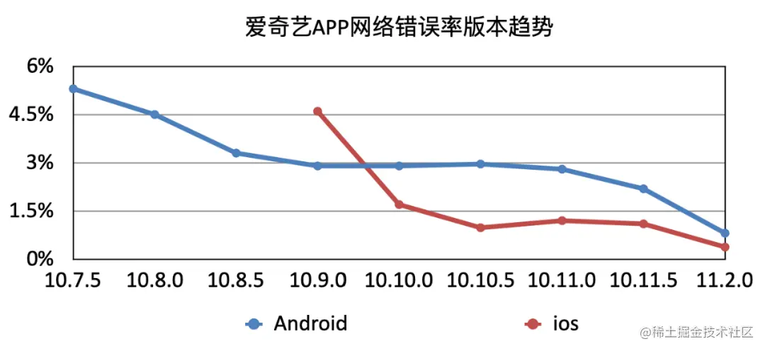 爱奇艺 APP 的网络错误率,随着版本的持续优化,Android 端错误率从最初 5.3%,目前稳定在 0.48%; IOS 端错误率从最初 4.63%,目前稳定在 0.35%。