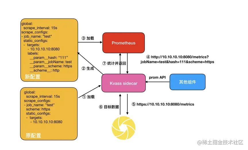 - Kvass sidecar: 用于接收Coordinator下发的采集任务,生成新的配置文件给Prometheus,也服务维护target负载情况。