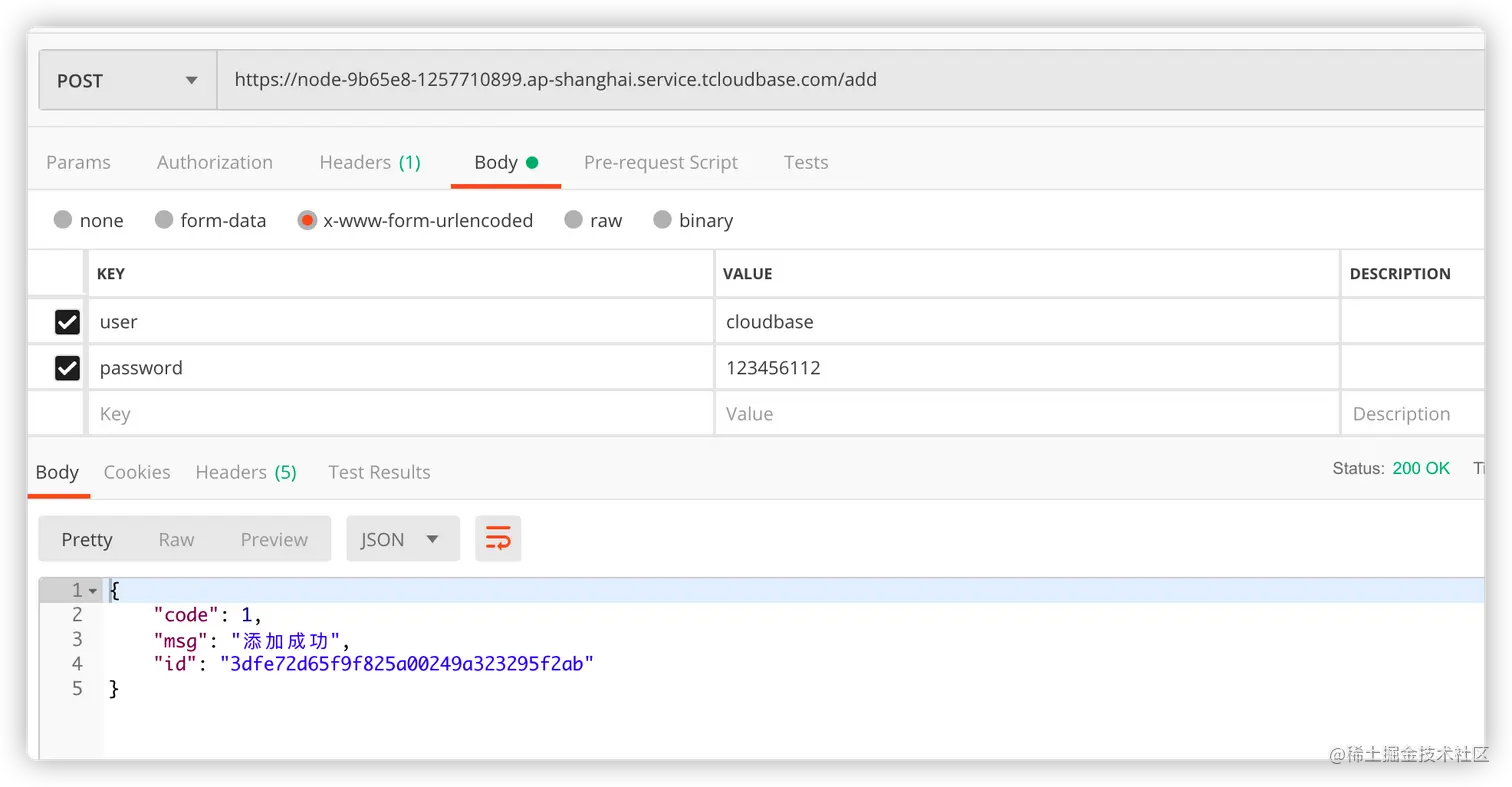 记录已经成功写入(CloudBase 服务端 SDK 已经与云托管进行集成,无需手工填入密钥即可使用)