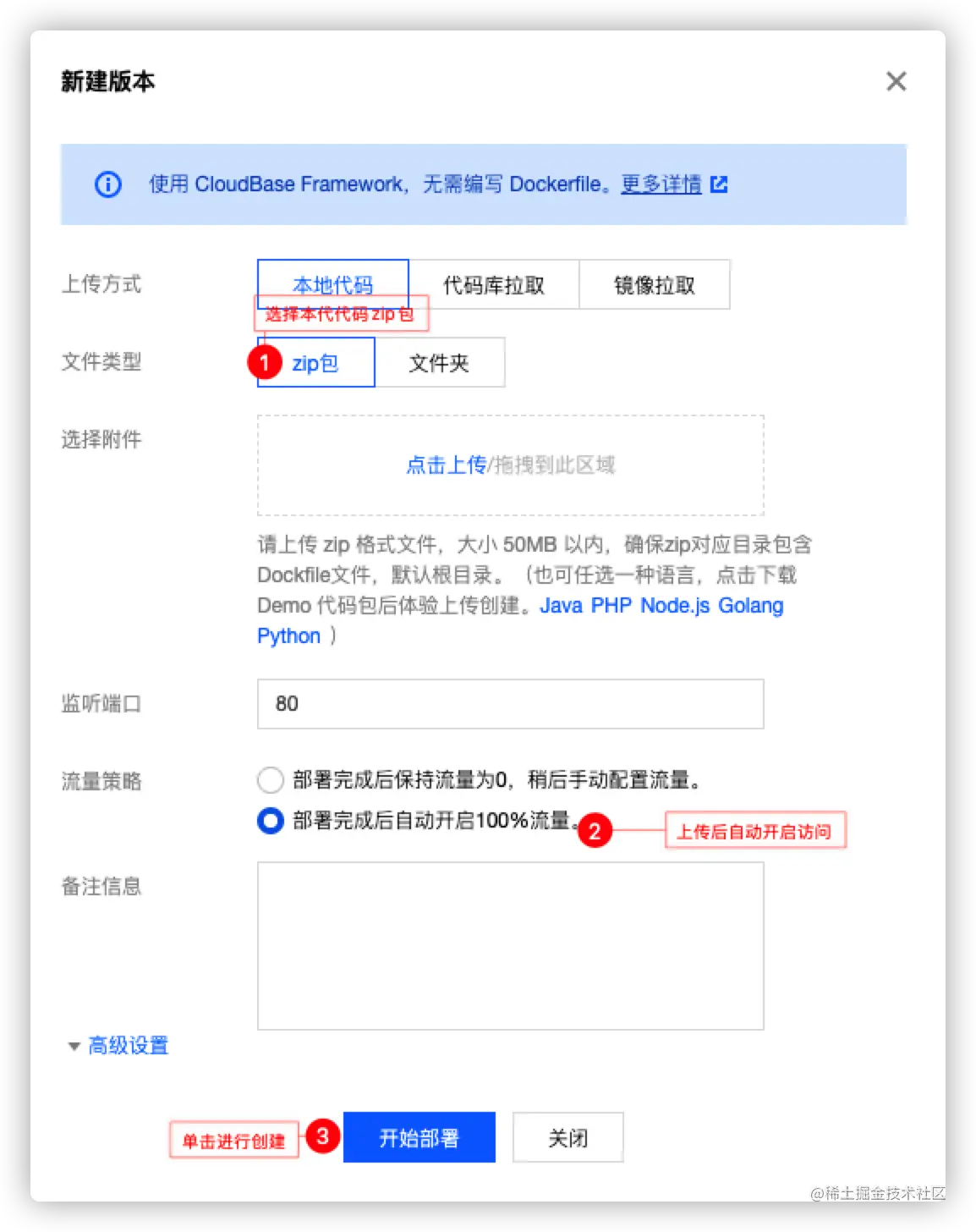 进入服务后,单击「新建版本」,可选择多种上传方式本文中使用本地代码上传方式,按照图中步骤依次操作后,单击「开始部署」(部署时间跟DockerFile文件中的复杂程度有关),