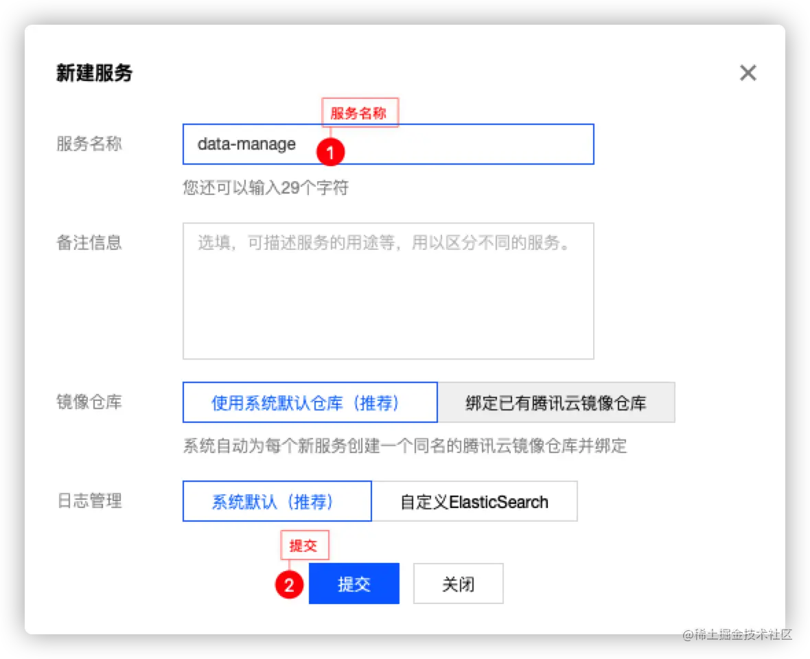 单击「新建服务」,填写服务名称、备注信息(选填)后,单击「提交」