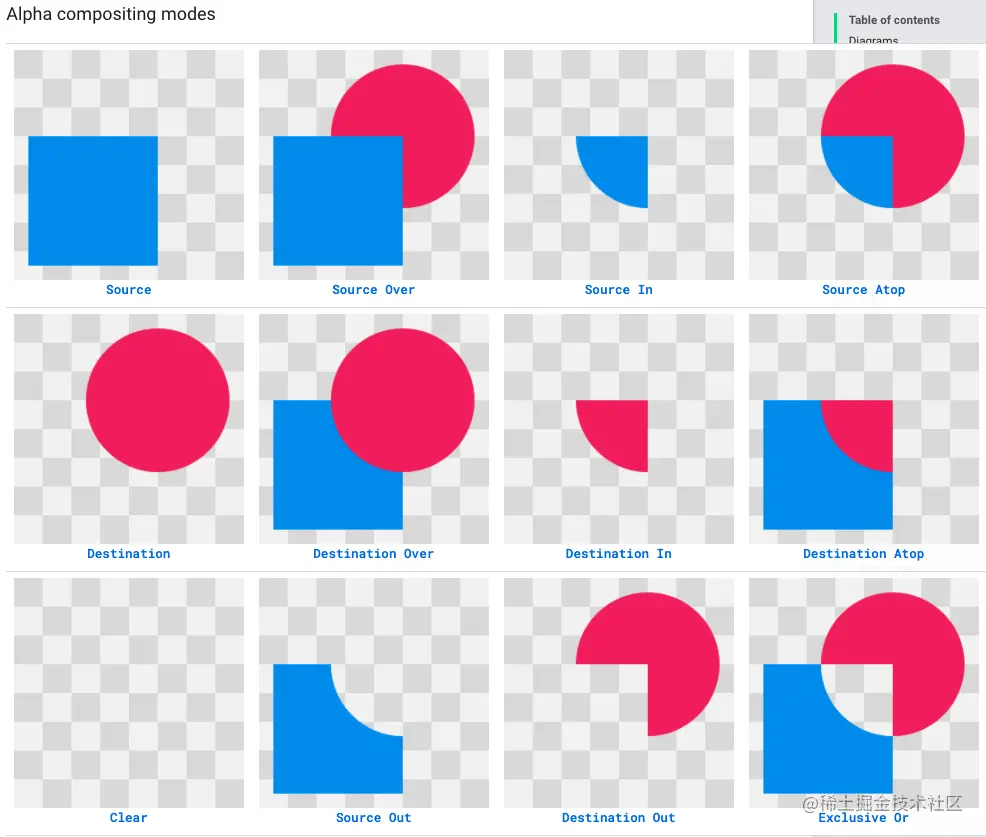 这里SRC_IN 也就是Source In 字面意思可以理解为源图片蓝色方形在目标图片红色原型中的展示,所以最后效果是一个蓝色90度扇形