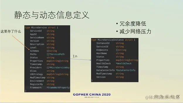 减少数据信息量,抽出公共部分统一管理,通过静态信息来划分实例组。这样微服务与微服务实例为1对n的映射,将微服务名、版本、数据中心等信息都抽到了公共部分,通过降低冗余度,来减少网络的开销,同时也规范化了微服务模型。