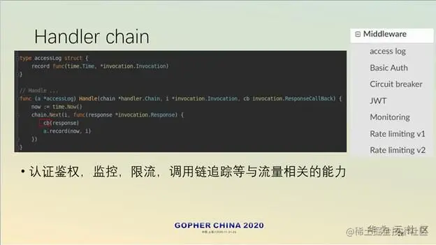 目前Go Chassis已经支持的中间件包括限流、熔断、负载均衡、认证鉴权和审计,都用此机制来实现:将公司全部的工具链,服务治理手段,安全合规等都落入到处理链中,来快速加快研发速度,并统一规范,减少管理负担。
