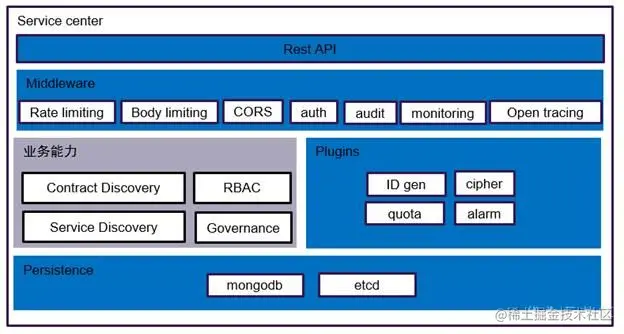 我们刚才看到的只是水面之上的冰山,水面之下还隐藏着大量的基础能力需要编写。真的要达成微服务架构模式的愿景,需要繁重的工作量。就像冰山那样,我们要将通用能力沉淀下去,能够复用。如果让各个业务团队同时照顾冰山上下,各自开发各自的,那结果将是灾难性的,企业用人成本极高,下面让我们展开Service Center的架构看看。