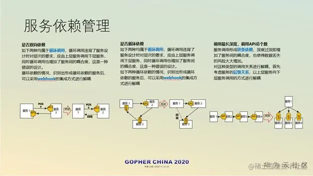 调用层级过高将引起定位困难、性能下降的问题,合理的层级是3个服务:a->b->c的调用就可以完成一次调用。彼此互相依赖的两个服务在功能升级或者变更时要花费更多时间来分析影响,比如ab互相依赖,一个新功能涉及2个都要更改,那怎么一起上线?
