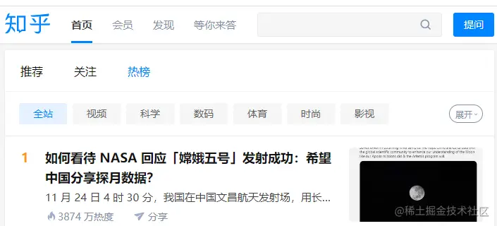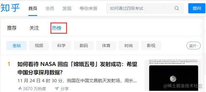例如现在知乎处于一个登录的状态,并且选择的是热榜这一专栏