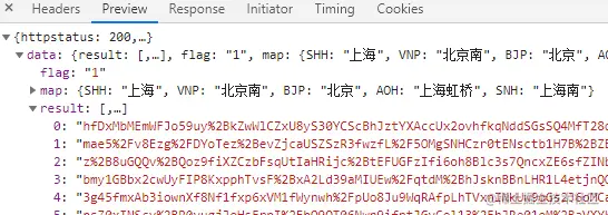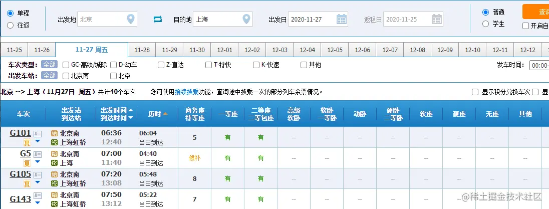 如下图是一个北京到上海的车次列表。这个车次列表是通过ajax请求得到的数据。