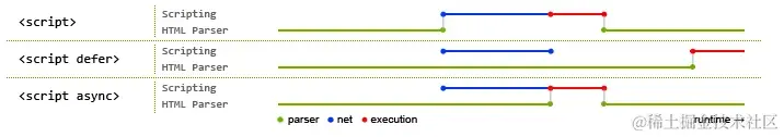 - 脚本没有 defer 或 async,浏览器会立即加载并执行指定的脚本,也就是说不等 待后续载入的文档元素,读到就加载并执行。