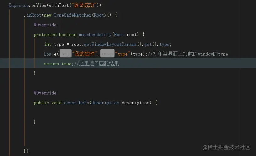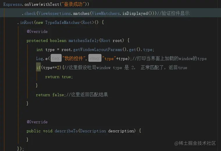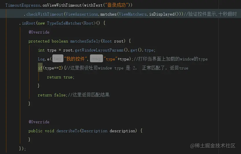 这里有一个问题,如果吐司的话,是一闪而过,如果没有在正确的时间执行,这段代码可能会报错?(担心是多于的,root 是有一个超时等待机制,在一段的时间内,matchesSafely 没有匹配到window type,也就是返回true 他会一直循环执行匹配逻辑)