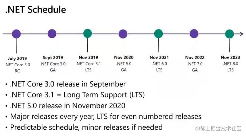 .NET Core 3.1 已于 2019/12推出,为 LTS (Long Term Support,长期支援版),之后.NET Core 将更名.NET,固定每年释出新版,并定义双数版号为LTS版,单数版号为Current版。