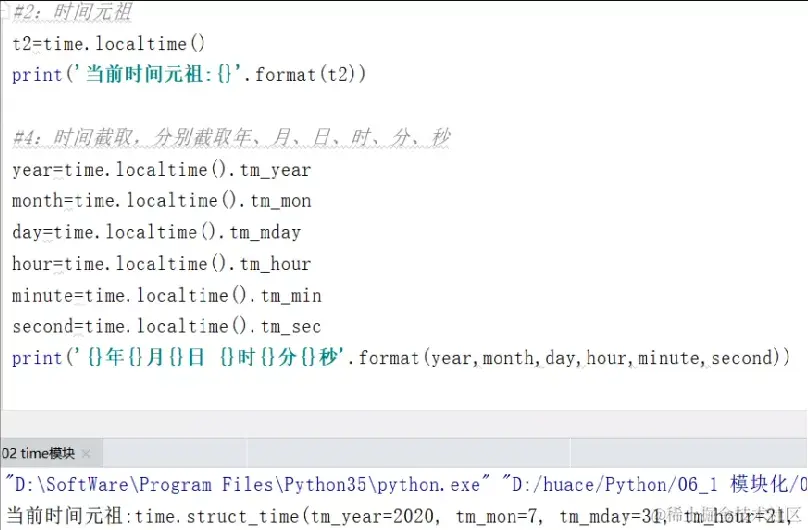 案例2:对获取的当前时间元组分别以年、月、日、时、分、秒的部分进行截取,分别获取各部分的值并进行输出