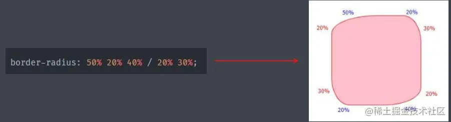 /的属性值写法 border-radius属性值中出现了/斜线,那么/前面可以设置水平方向四种值的写法,/后面可以设置垂直方向四种值的写法。 实例: