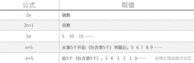 - n可以是:数字、关键字(even偶数、odd奇数)、公式