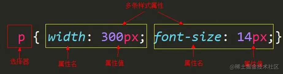 - css样式的属性,属性名和属性值的键值对写法为k:v;。