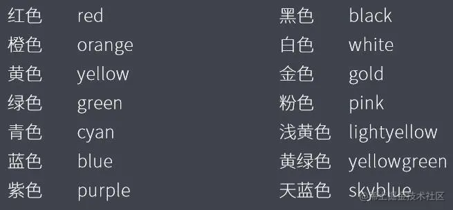 - 属性值:颜色名、颜色值