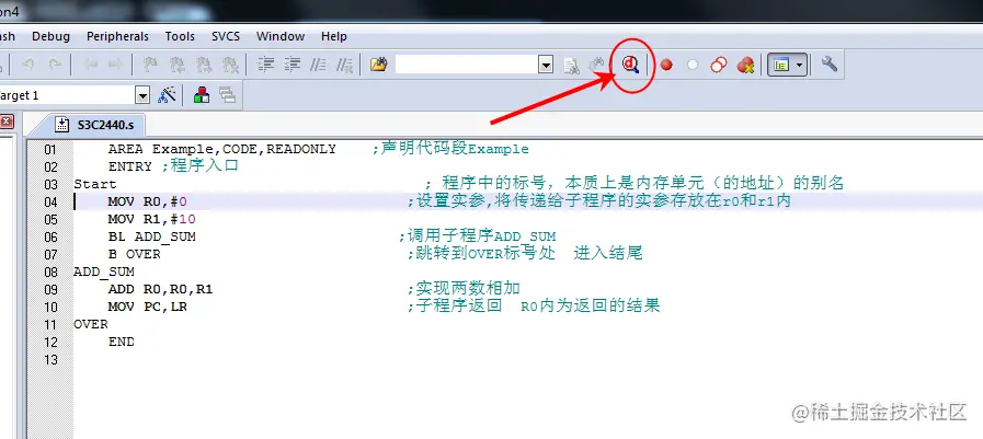AREA Example,CODE,READONLY ;声明代码段Example ENTRY ;程序入口Start ; 程序中的标号,本质上是内存单元(的地址)的别名 MOV R0,#0 ;设置实参,将传递给子程序的实参存放在r0和r1内 MOV R1,#10 BL ADD_SUM ;调用子程序ADD_SUM B OVER ;跳转到OVER标号处 进入结尾ADD_SUM ADD R0,R0,R1 ;实现两数相加 MOV PC,LR ;子程序返回 R0内为返回的结果OVER END