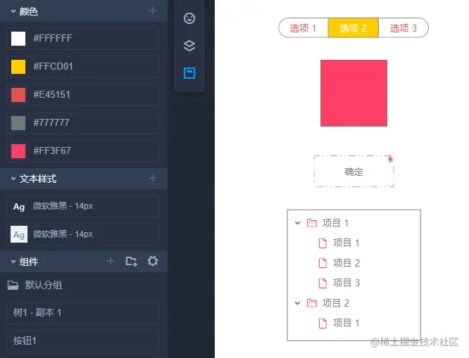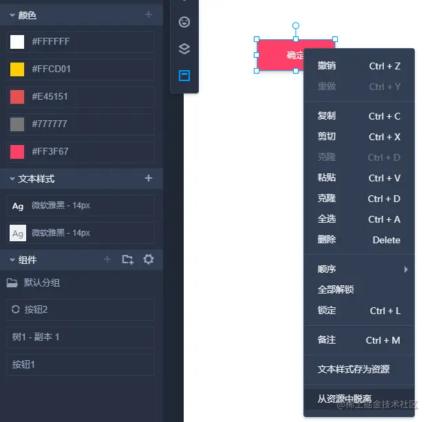在摹客在线设计中,添加资源非常方便,只需要选中组件,通过右键菜单或点击左侧颜色、字符样式、组件后面的“+”,就可以快速将组件相关信息存到资源库中。