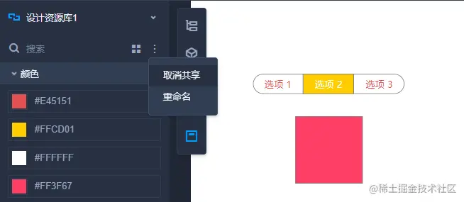 保存在设计资源库中的组件,可以重命名、编辑、删除,以及拖拽调整排序。点击设计资源面板右上角的布局按钮,还可以切换资源的布局方式。
