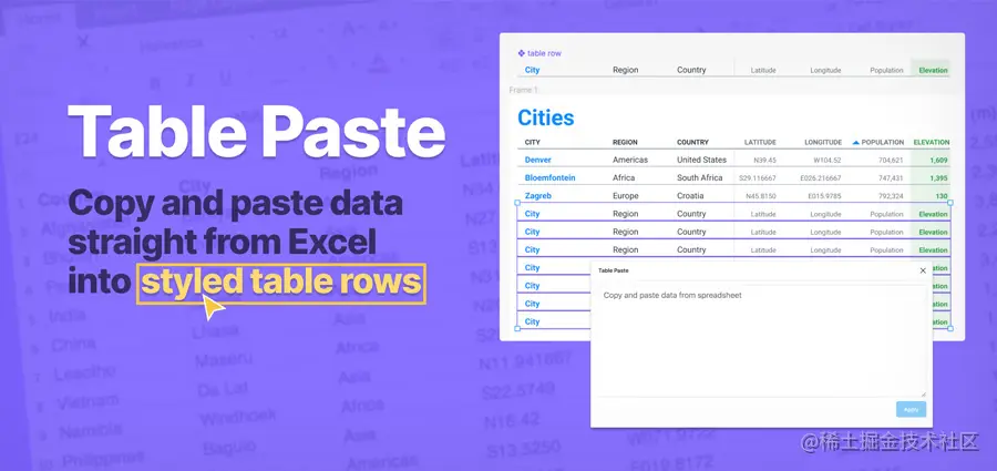 将Excle内容转移到figma的利器,非常适合经常处理数据可视化工作的同学。先创建一行表格,然后添加文本字段,生成组件,然后粘贴来自 Excel 的表单内容就行了。至于表格的样式则可以自由调整,不影响内容的粘贴。