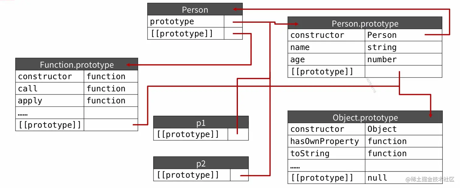 (自身普通属性prototype指向Person.prototype(只有函数function有,其他为undefined),原型属性[[prototype]] 指向 Function.prorotype)