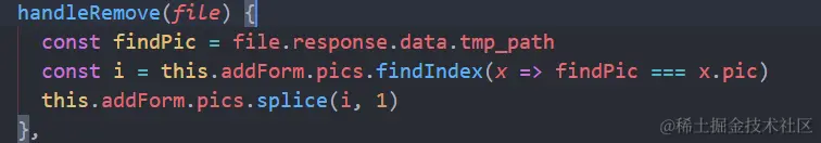 (4)点击删除图片后,在原存储图片的数组中,删除对应图片,使用:on-remove,绑定函数,当删除某张图片后,会返回对应图片的信息,定义变量存储起来,在利用findIndex()函数,判断获取回来的图片路径和存取图片路径的数组比对,返回对应数组的下标,后利用splic(),删除对应下标,ps:属性对应使用查看官方文档
